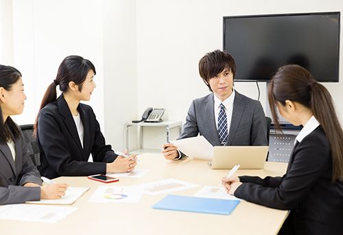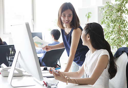 先輩社員や担当者がそばにつき、商品知識や提案力などの向上を目標に実践的に指導します。